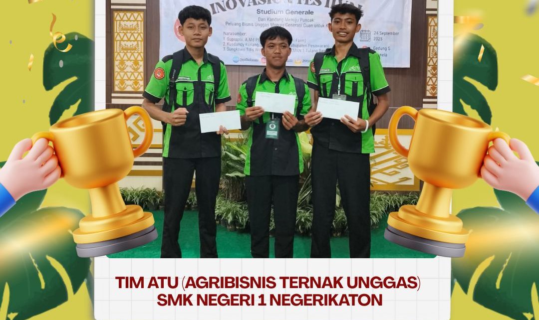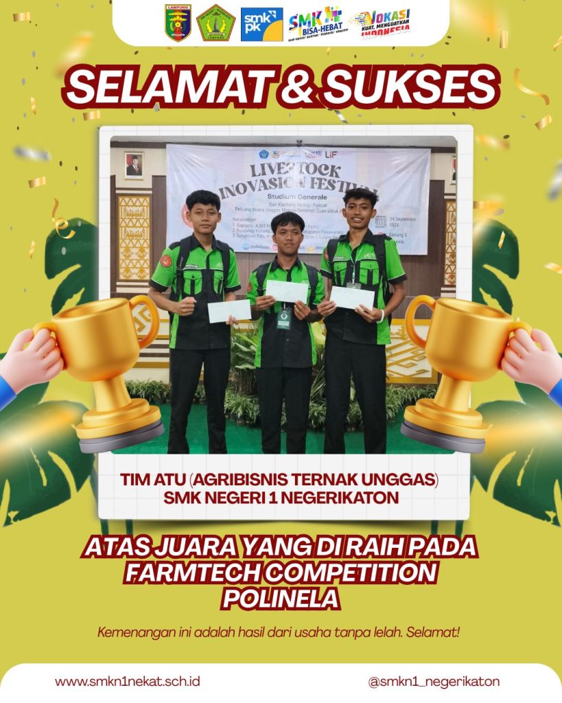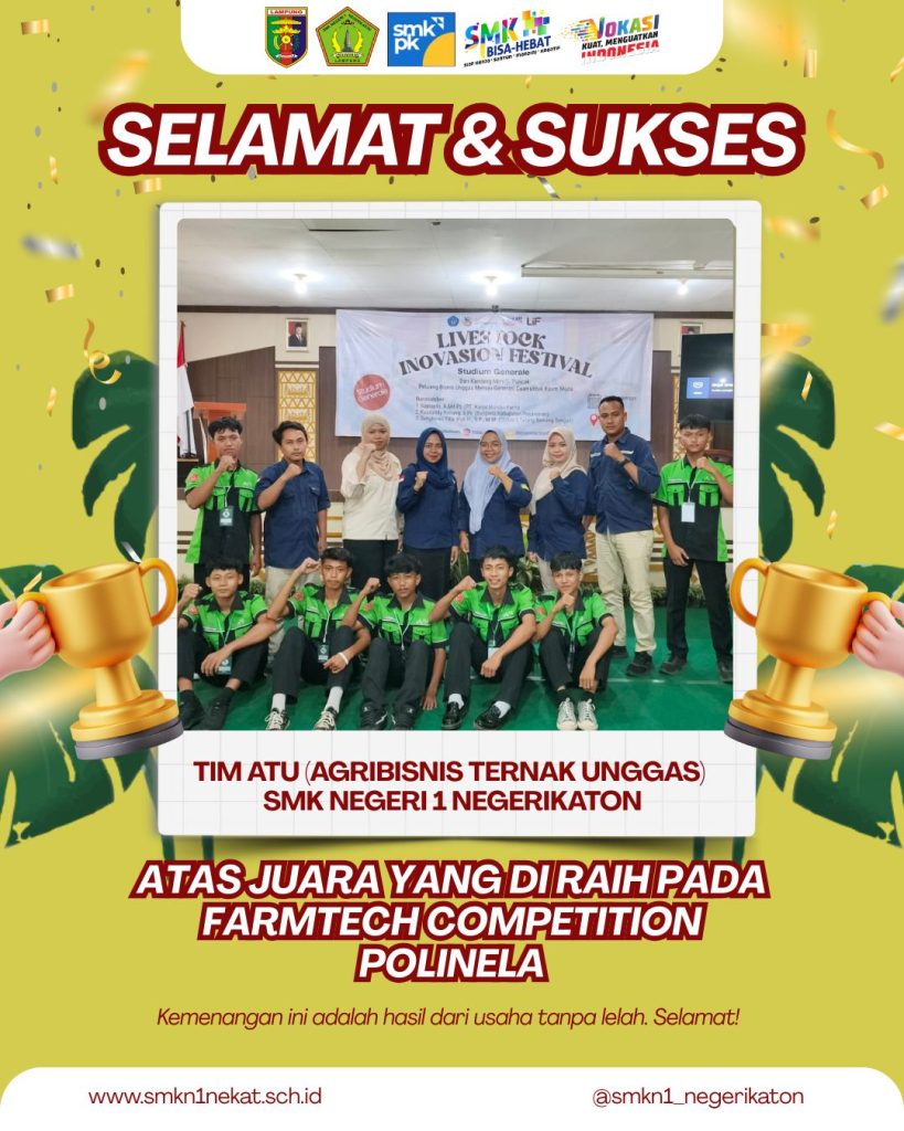Negerikaton – Jurusan Agribisnis Ternak Unggas (ATU) SMKN 1 Negerikaton kembali menorehkan prestasi membanggakan. Pada ajang Farmtech Competition yang diselenggarakan di Politeknik Negeri Lampung (Polinela) pada hari Rabu, 24 September 2025, siswa-siswa ATU berhasil meraih juara dalam beberapa cabang lomba.