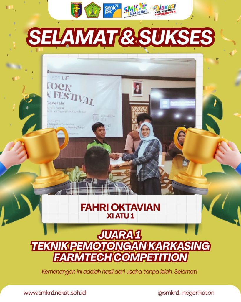 - Fahri Octavian (XI ATU 1) meraih Juara 1 Teknik Pemotongan Karkas.